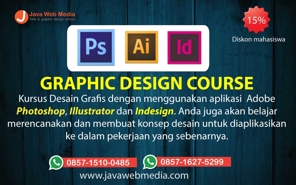 Anda akan belajar desain grafis mulai dari tahap brief project, dasar-dasar desain secara manual ataupun dengan program (Photoshop, Illustrator dan Indesign) dan juga praktek langsung bagaimana mencetak dan mengaplikasikan hasil desain tersebut.